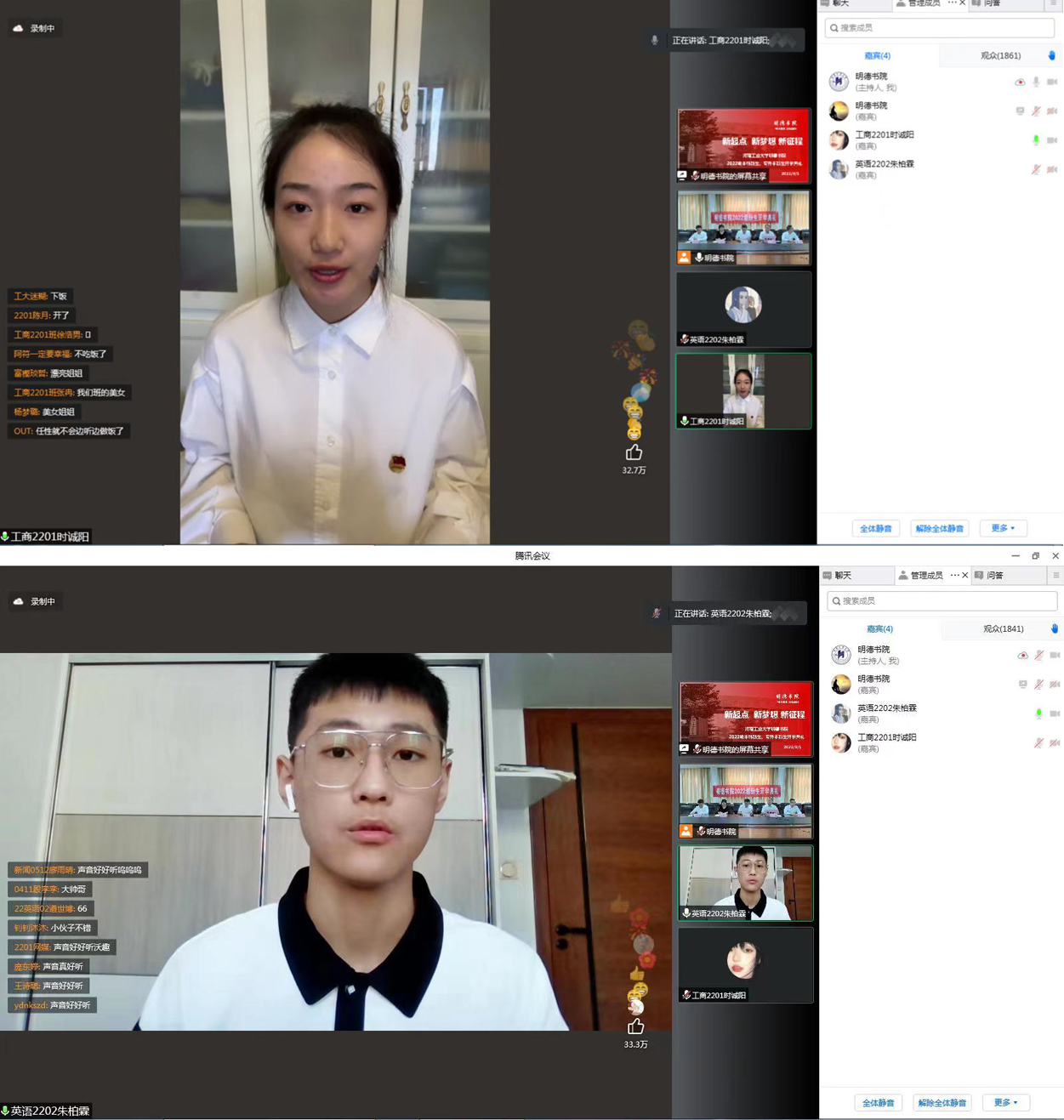 新生代表工商管理专业2201班时诚阳同学、英语专业2202班朱柏霖同学分别进行发言,表达了对大学生活的憧憬和向往。他们表示,大学是一个新的起点,是一个充满机遇和挑战的地方,一定会牢记老师与家长的谆谆教导与深切期望,在未来的四年里一起奋斗,一起微笑,一起去赢得成功。四年后,回眸青春岁月,会问心无愧的说:“感谢工大,感谢有你”。