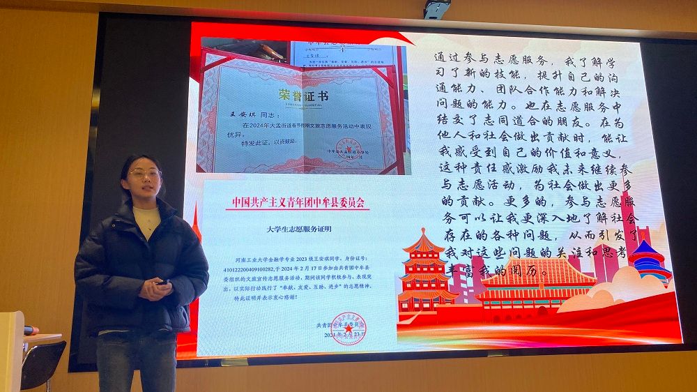 学子们积极响应号召,踏上回乡之旅。深入到乡村,社区,学校等地开展了丰富多彩的志愿服务活动,以积极的态度和创新的思维,积累了宝贵的经验和知识。会上,学生会主席曹仟喜介绍了2024年寒假社会实践活动的基本情况及进行汇报展示的团队情况,随后,学生依次进行了社会实践汇报,通过精彩纷呈的PPT、深情饱满的演讲全面展示了社会实践的过程和成果,分享了自己的社会实践经历和感悟。