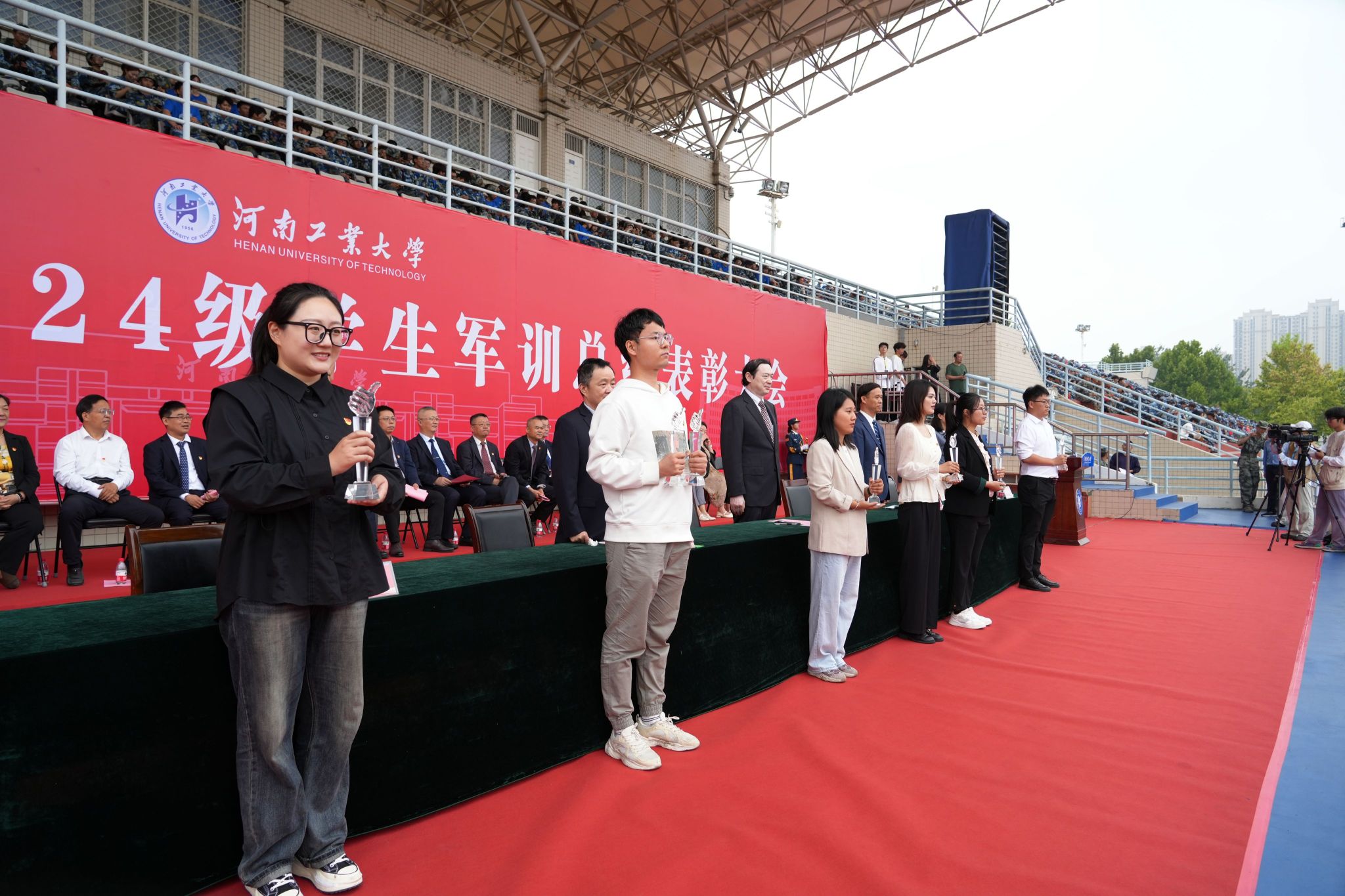 )主要负责同志、2024级新生辅导员和班主任代表、军训教官、全体2024级新生参加总结表彰大会。学工部部长、武装部部长王迪和校团委书记高泉分别主持表彰大会。