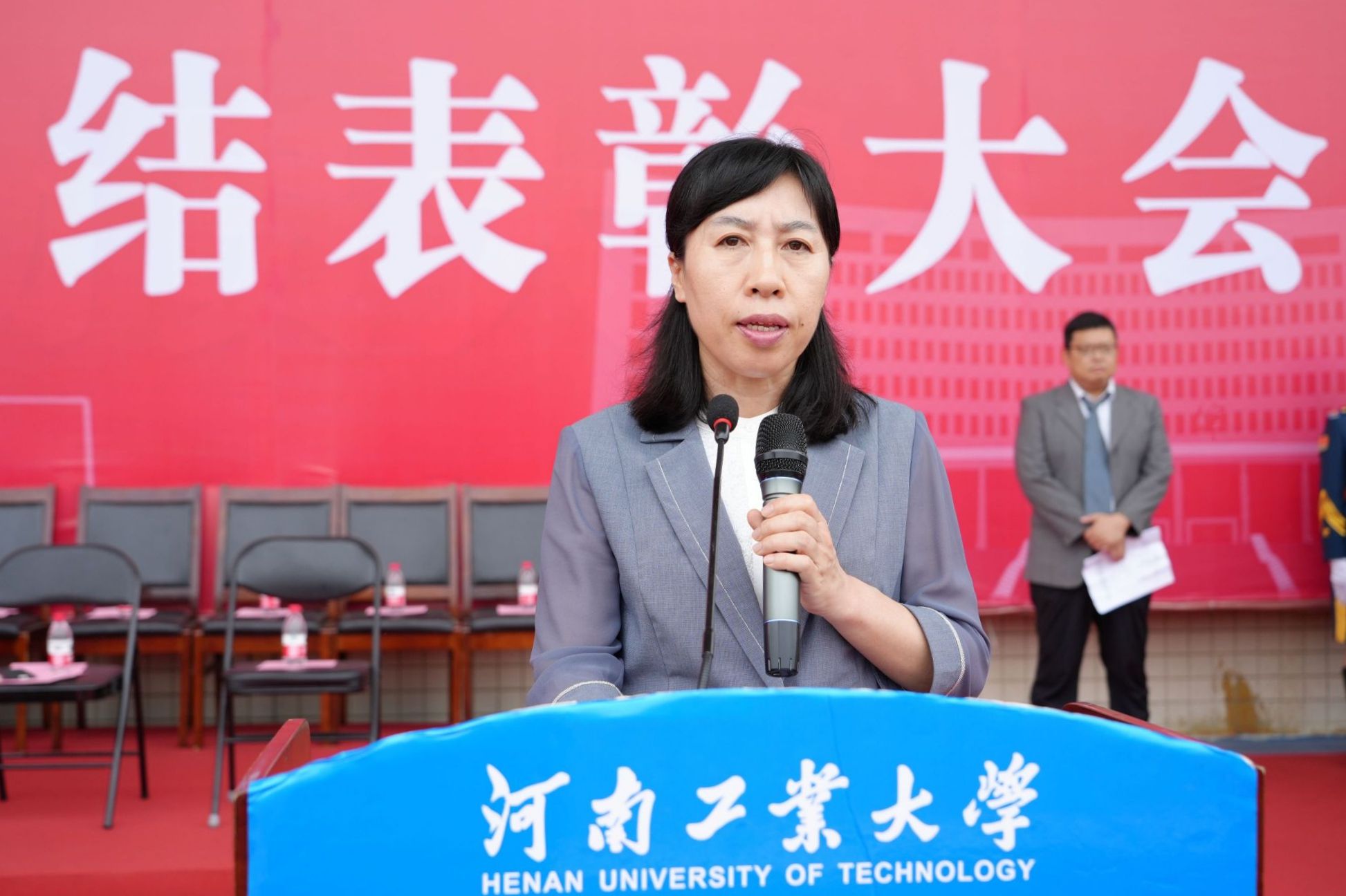 副校长李焕锋和副校长白艳红分别在嵩山路校区和莲花街校区宣读学校军训表彰文件。学校对军训先进单位、队列先进集体、歌咏比赛先进集体、内务先进集体以及军训优秀辅导员、优秀教官标兵等军训先进个人进行了表彰。