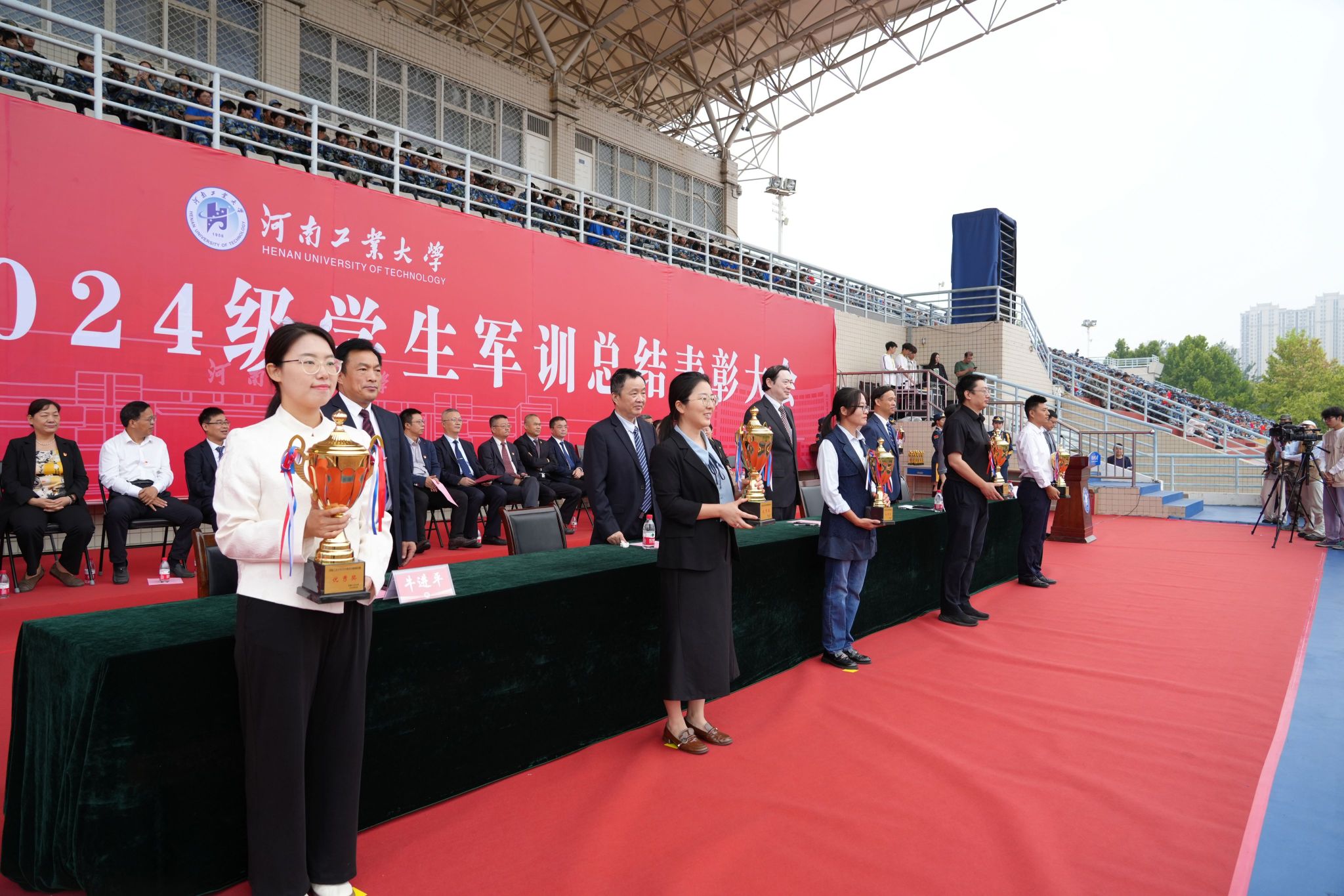 军训先进单位、队列先进集体、歌咏比赛先进集体、内务先进集体、军训优秀辅导员、优秀教官代表上台领奖
