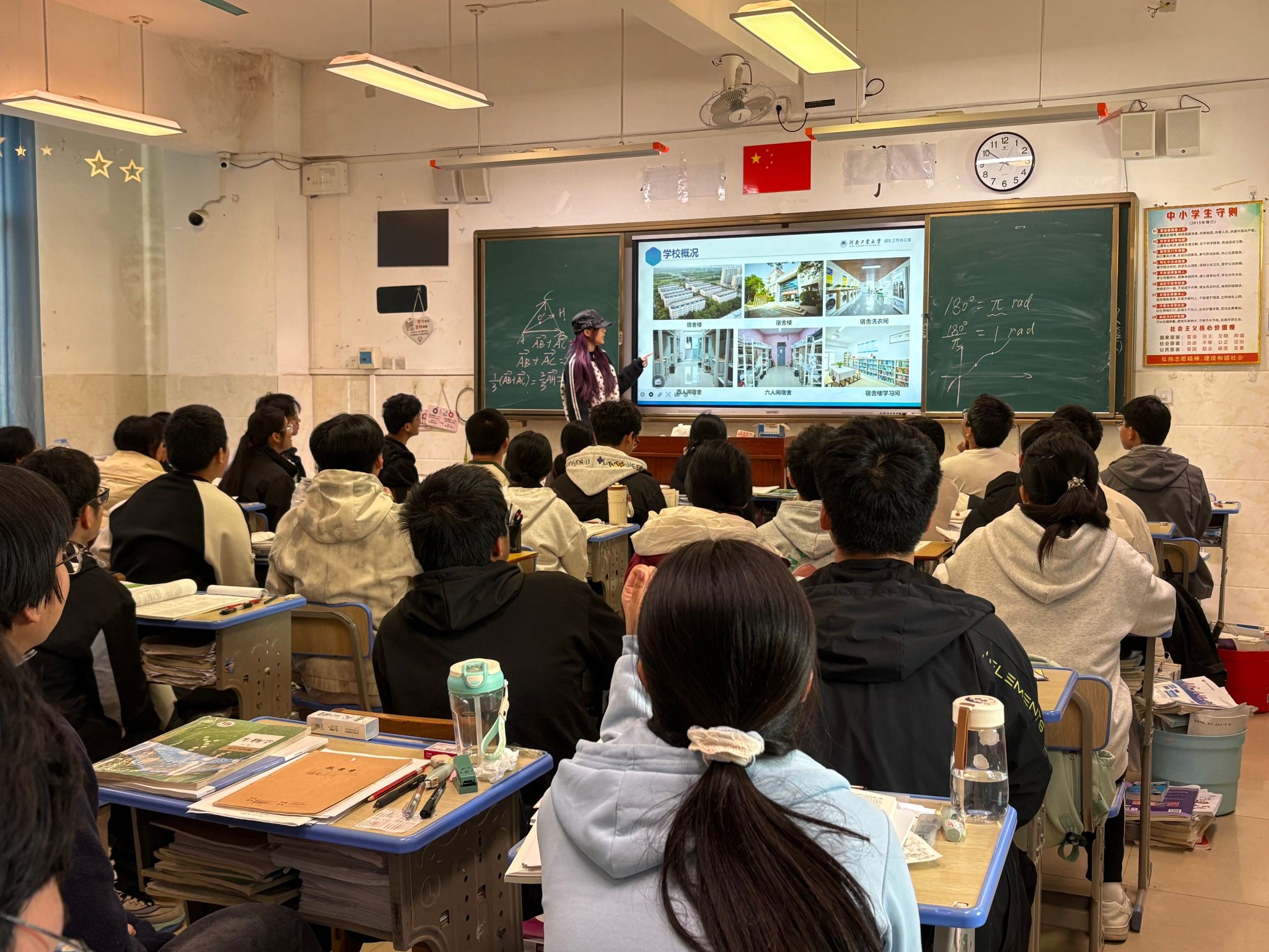 近日,通信工程专业学子李昕昊回到母校民权县高级中学,面向高一A2班开展了宣讲活动。他结合自身刚经历高考、初入大学的鲜活体验,通过生动的讲述和详实的资料,向学弟学妹们全景展现了河南工业大学的学术氛围、校园文化与多彩生活。针对高一学生处于目标确立期的特点,李昕昊重点解读了学校的学科优势与近年招生数据,帮助大家扫除信息差,明确努力方向。互动环节中,他耐心解答了关于学习与社团平衡等问题,并发放了学校宣传资料与定制书签,现场氛围热烈。