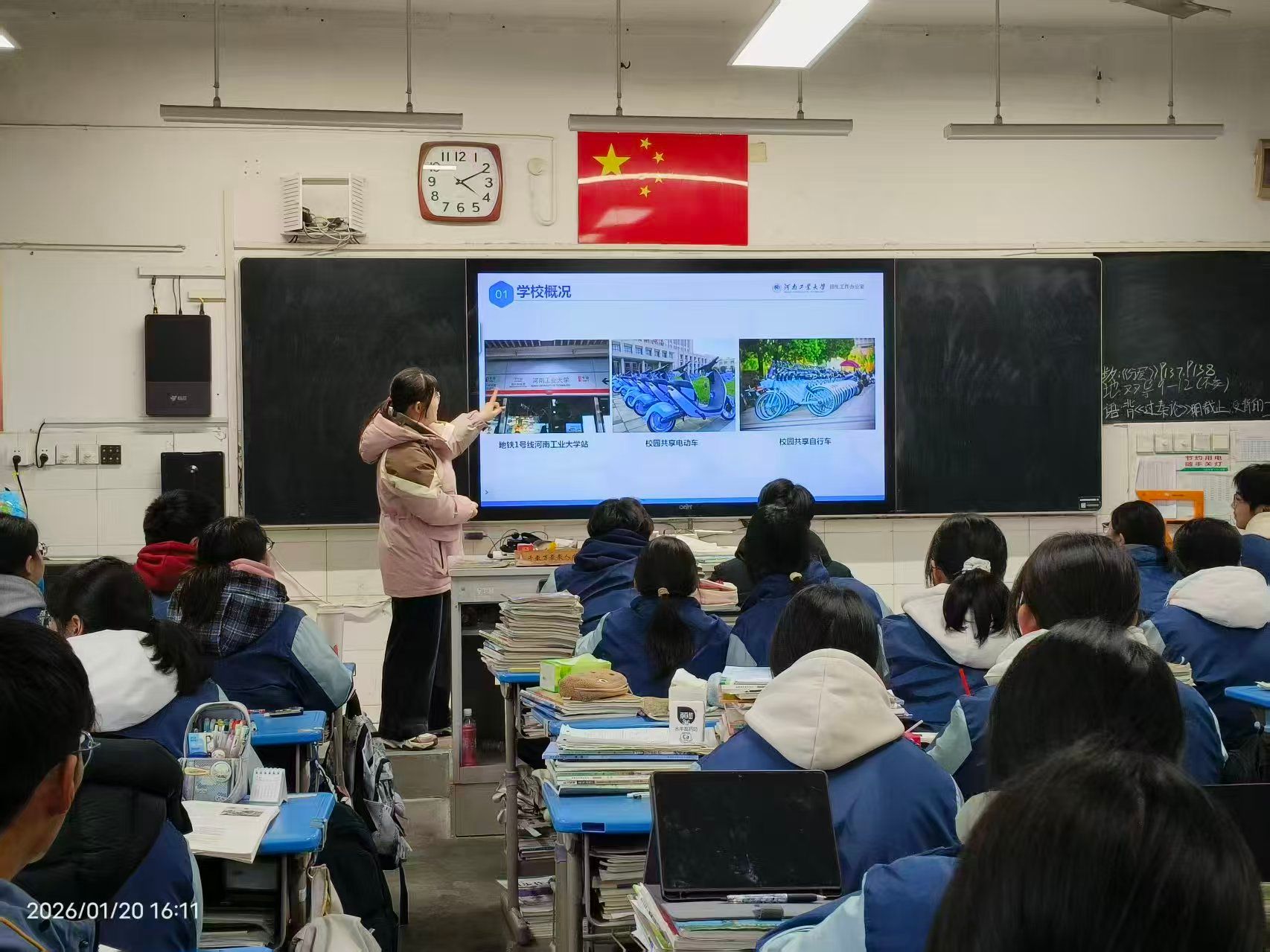 1月26日,杨梦涵在新乡一中进行了充满趣味与干货的宣讲。为了激发学弟学妹们对法学专业的兴趣,她精心挑选了多个贴近生活的趣味法律案例,通过生动的讲解引发大家的积极思考与互动;随后,结合自身备考经验,她分享了针对性极强的文科备考策略,从知识点梳理、答题技巧到心态调整,都给出了实用建议。本场宣讲让学弟学妹们沉浸式感受了河工大的独特魅力,更吸引众多同学萌生对河工大的向往之情。