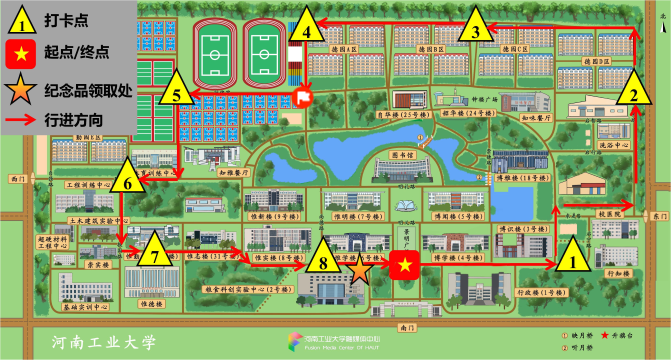 以景明广场南侧为起始点,沿明德路南段东行至明德路东段折向北行,至求是路东行启辰路继续北行至尽头向德园北路西行,德园北路尽头向南沿拓新路至行健路西行,在行健西路南行至笃行路折向西,至报国路南行到科学路东向后并入明德路南段回至景明广场终点,全程约3.5公里。图中黄色标记点为打卡点,小红旗标识为医疗保障点,箭头方向为行进方向。打卡点即为集章点,在每个打卡点完成相对应动作后即可打卡。