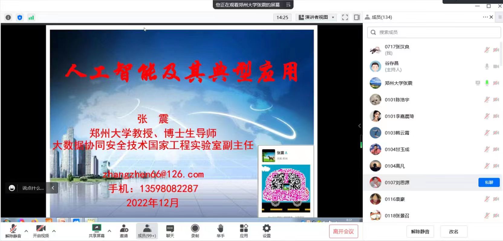 为了加强学习交流、营造学习氛围、开拓学生视野、推进人文素质教育,12月20日,由党委宣传部、校团委主办,美高梅金殿娱乐场 承办的第268期工大讲坛通过腾讯会议举办。此次讲坛以“人工智能及其典型应用”为题,特邀郑州大学电气与信息工程学院教授、博士生导师,公共安全研究院副院长、大数据协同安全技术国家工程实验室副主任,公安部视频工程项目专家、工信部工业领域评审专家、河南省智慧城市专家组长、河南省信息化专家咨询委员会专家张震为主讲嘉宾。美高梅金殿娱乐场 党委书记魏朝举、院长谷存昌及300余名师生代表参加了本次讲坛,讲坛由谷存昌主持。
