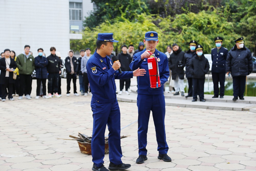 随后,由消防救援大队指战员们组织参会人员在喷泉广场开展了消防实操演练。消防员同志现场讲解了干粉灭火器、二氧化碳灭火器、水基型灭火器的区别和使用方法,重点强调了消防标识识别方法、消防通道疏散要点、火灾疏散的动作要领和注意事项等内容,并分别进行了现场演示,“手把手”指导学生进行灭火器实操演练,学生们积极参与,轮流上阵,亲身体验,学习掌握灭火器“一提、二拔、三握、四压”等使用技能,现场气氛十分活跃。