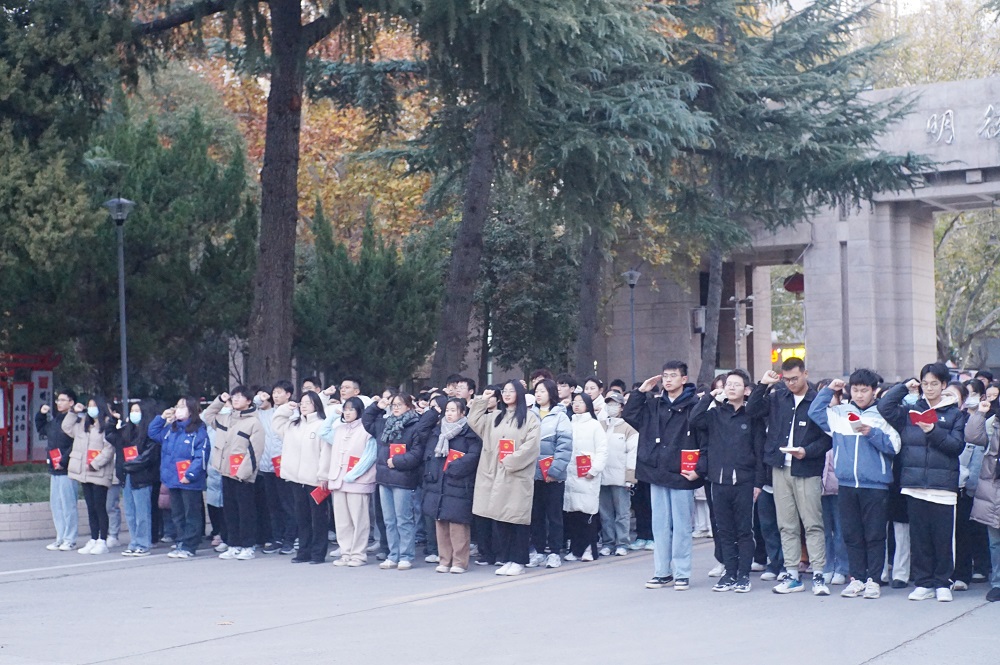 本次活动分为升国旗和宪法宣誓诵读两个环节。首先进行的环节是升国旗仪式,法学专业全体同学面向国旗行注目礼,奏唱中华人民共和国国歌。升旗过程庄严神圣,激发了同学们的爱国情怀和民族自豪感。紧接着进行宪法诵读宣誓仪式,同学们整齐排列,右手举拳,诵读宪法誓词,表达对宪法权威的尊崇和敬畏。