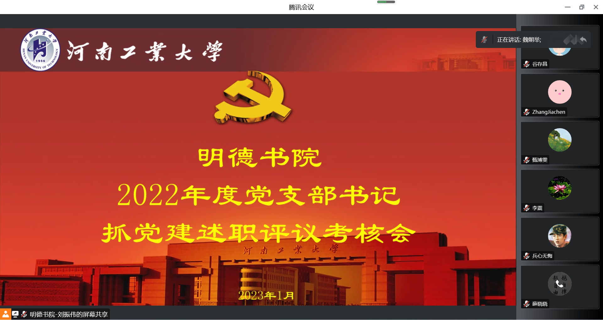 魏朝举分别对各支部书记抓党建述职工作进行了点评,并进行了总结发言。他对各支部的工作给予了充分肯定,尤其是对全体党员在2022年度校园疫情防控工作中的表现给予了高度评价,并就做好下一年度党建工作提出三点要求:一是要深入学习贯彻党的二十大精神,用习近平新时代中国特色社会主义思想武装头脑,进一步激发各党支部活力;二是要认真总结,发扬成绩、改进不足,深入推进“支部品牌”特色项目建设;三是要认真谋划2023年度工作,发挥双院协同育人合力,积极探索人才培养模式改革,为学校“双一流”创建作出更多贡献。(美高梅金殿娱乐场 撰稿:刘振伟  审校:刘飞翔 审核:魏朝举)