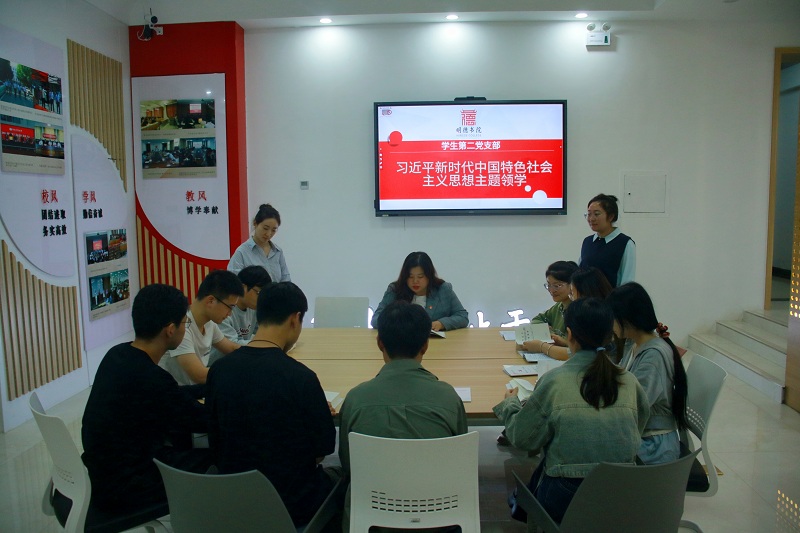 学生第二支部设立“每周领学日”,由支部支委和学生党员轮流担当“领学员”,按照计划表规定的主题,每周一晚上在社区内对支部的积极分子和党员进行不同主题的理论教育领学活动。9月30日晚,二支部全体党员在明德社区办公楼大厅学生沙龙空间,由支部组织委员蒋祎鸣对党员们进行习近平新时代中国特色社会主义思想主题领学活动。