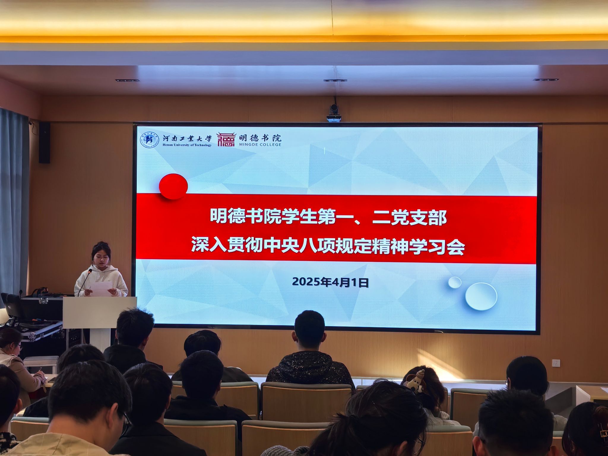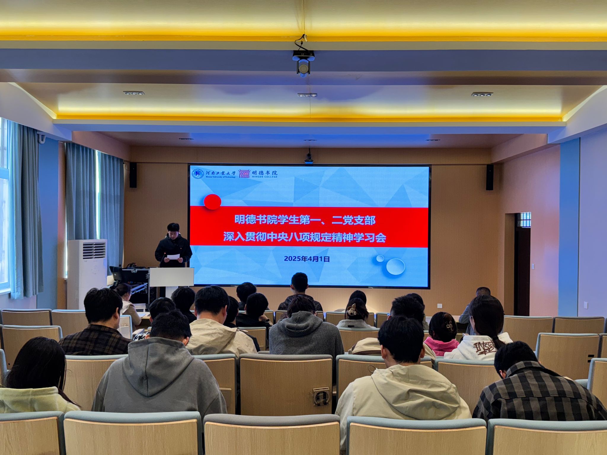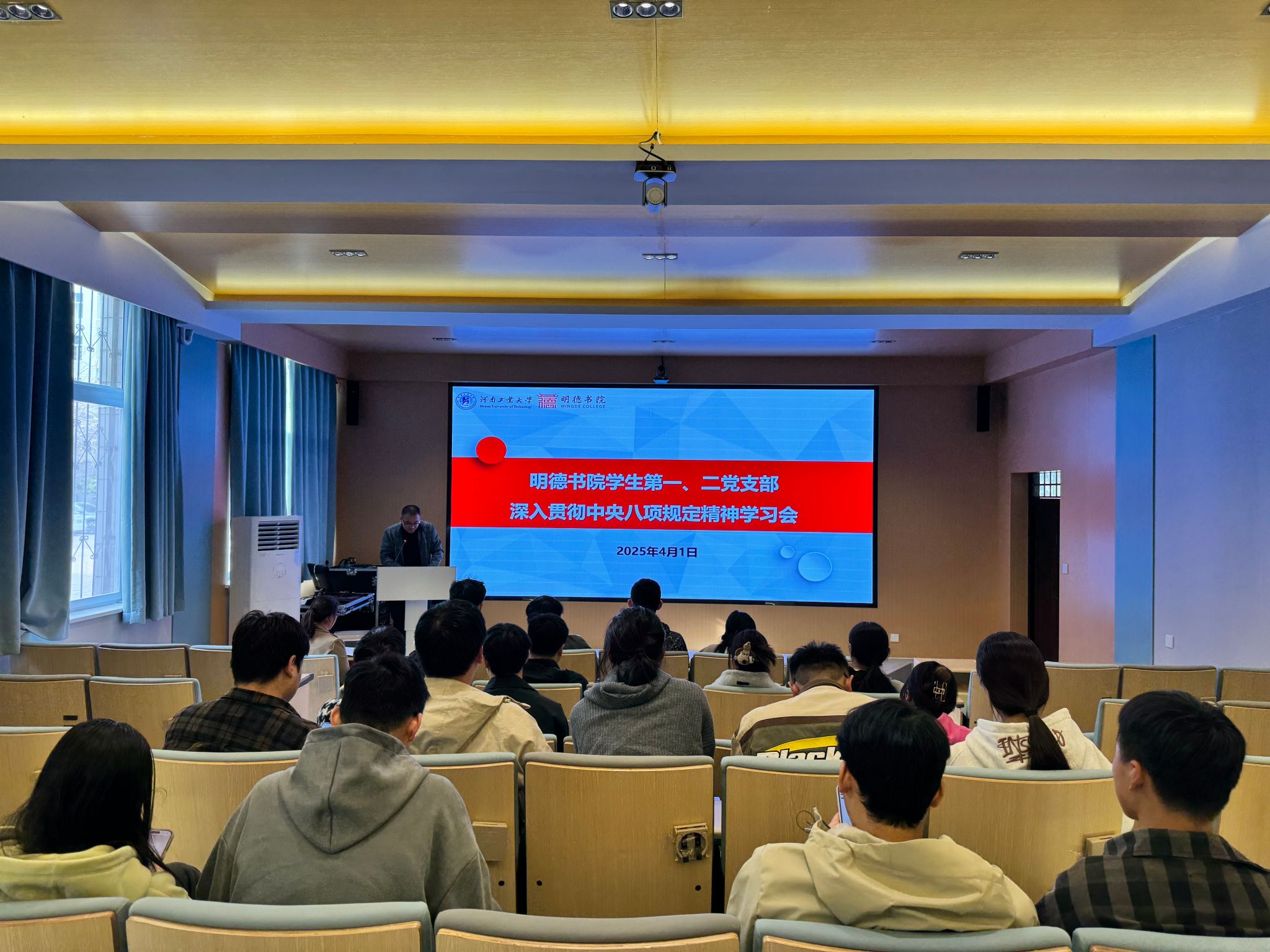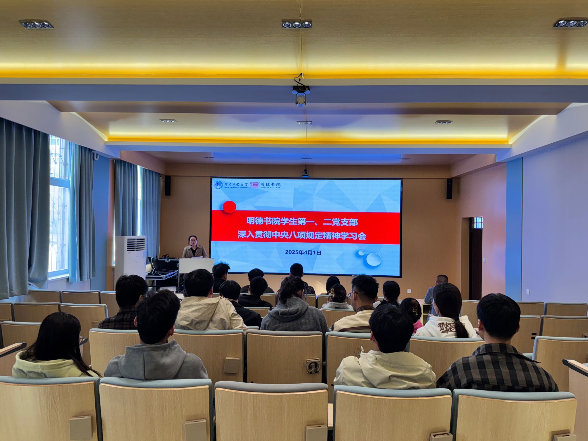 学生第一、二党支部在实验楼118会议室开展学习。会议由学生第一党支部书记刘振伟主持。刘振伟逐字逐句领学了《十八届中央政治局关于改进工作作风、密切联系群众的八项规定》,学生第二党支部书记薛晓晓领学了《擦亮新时代党的建设“金色名片”——以习近平同志为核心的党中央贯彻执行中央八项规定、推进作风建设纪实》中两会期间的节俭之风以及总书记到贵州、云南考察时强调的作风建设。学生党员代表安紫钰和王博识分别发言,他们深刻强调了八项规定不仅是党风政风的指南,也是大学生成长的精神指引。他们呼吁同学们将规定精神融入日常,培养务实、自律的品质,为成为对社会有贡献的人才奠定坚实基础。