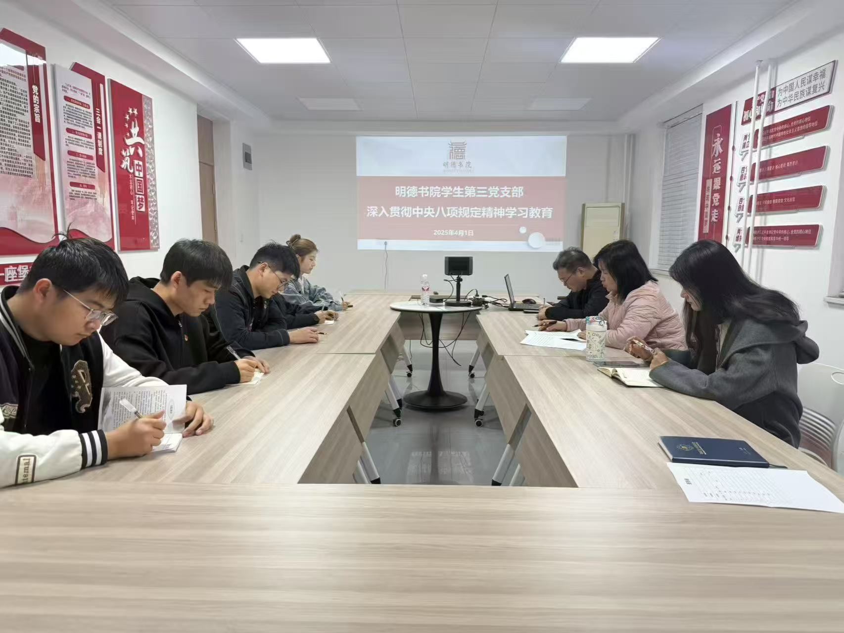 同时,学生第三党支部在一站式社区党建会议室开展,支部书记李晴晴领学了《中央政治局关于改进工作作风、密切联系群众的八项规定》内容。随后,支部党员们就中央八项规定精神展开了热烈的分组研讨。