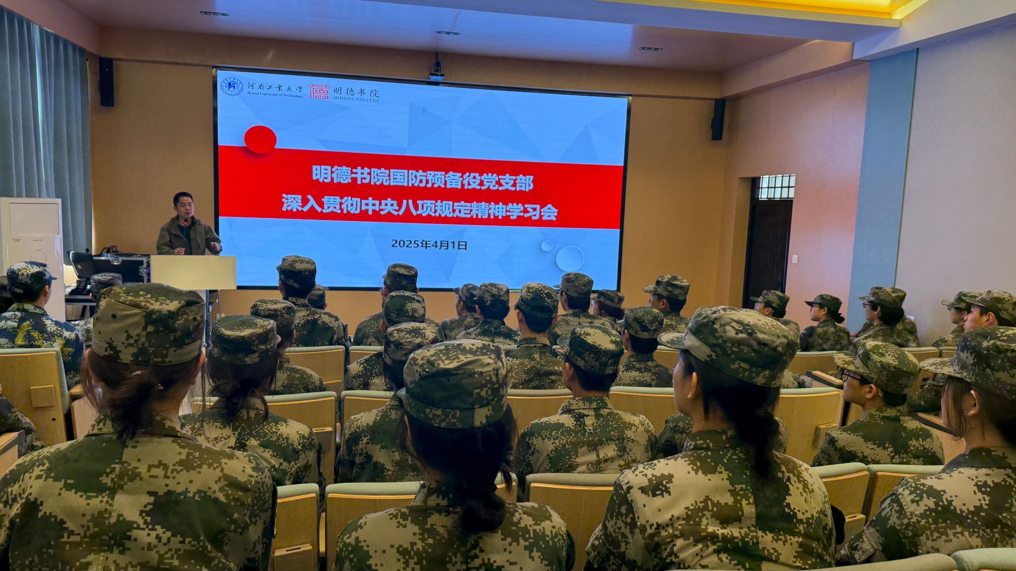 国防预备役党支部在实验楼118会议室开展学习活动,支部书记谷保材结合军事化管理经验,分享了“严纪律守规矩”的实践心得。学生党员代表宋梦妍结合预备役支部日常工作,分享了自己的心得体会。她表示:“预备役生涯不仅是军事素养的提升,更是精神品格的塑造。在今后的学习和生活中,我将以更高标准要求自己,将中央八项规定精神融入到日常行动中。”